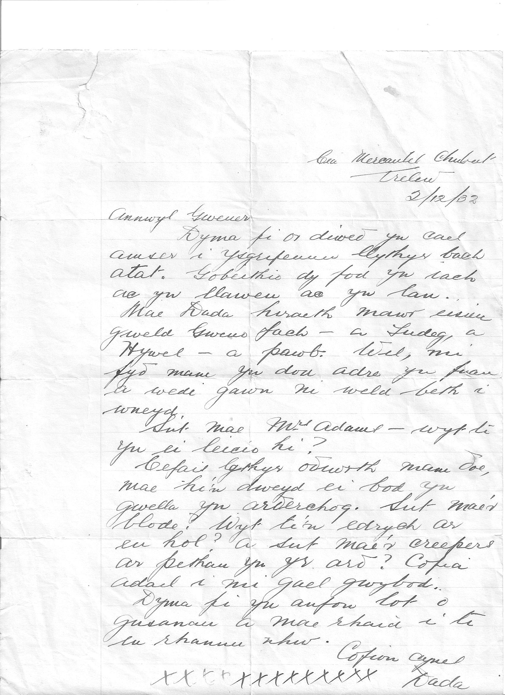 Papá tiene una gran nostalgia y quiere ver a su “Gweno bach”(pequeña Gwener) a Tudeg, a Hywel y a todos.